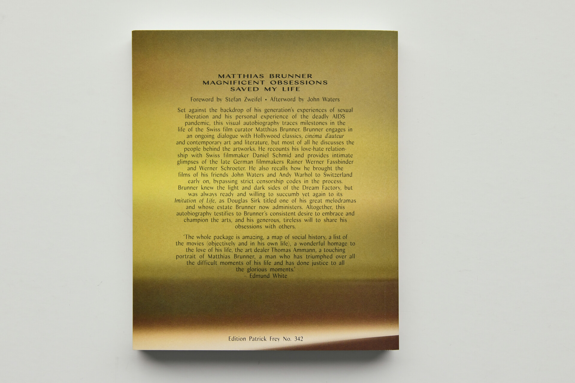 So verschieden die Leben, so verschieden die Biografien. Und doch ist Magnificent Obsessions Saved My Life eine (Auto-)Biografie der besonderen Art: Nicht nur fokussiert das Buch fast schlaglichtartig Schlüsselszenen im Leben eines Menschen der Nachkriegsgeneration, aufgewachsen, wie so viele, in einer dysfunktionalen Familie, vor dem Hintergrund geteilter Erfahrungen der 68er-Generation mit ihrer sexuellen Befreiung sowie zwei hautnah erlebter Pandemien – Aids und Corona. Im Dialog auch mit Werken des grossen Hollywood-Kinos, der Film-Avantgarde und zeitgenössischer Kunst bringen sie sich gegenseitig erst zum Sprechen. Denn ein Film, ein Kunstwerk ist nichts, wenn es einem nichts über das eigene Leben sagt. Kino und Kunst – und eben dieses Buch: Stets erzählt es über das, was war und was möglich gewesen wäre. Magnificent Obsessions tut dies in Text und Bild, angereichert mit Filmstills aus Brunners eindrücklicher Sammlung sowie Reproduktionen geliebter Kunstwerke. Aber wie im Film stehen die Menschen im Zentrum, Protagonist:innen, über die Brunner mal beissend direkt, aber auch zugewandt und bisweilen fast zärtlich schreibt. Es gibt immer zwei Bewegungen in diesem Leben: eine Flucht in die Künste wie auch den Willen und die Grosszügigkeit, diese Obsessionen zu teilen, sie unermüdlich zu vermitteln. Der Filmkurator Brunner brachte schon früh – an der Zensur vorbei – Filme von John Waters oder Andy Warhol, mit denen er auch freundschaftlich verbunden war, in die Schweiz. Vor der Verbreitung des Internet hätte man diese sonst nicht oder erst viel später zu sehen bekommen. Brunner weiss um Licht- und Schattenseiten der Traumfabrik, lässt sich aber immer wieder gerne verführen: Imitation of Life, so der Titel eines des grossen Melodramen des Regisseurs Douglas Sirk, den Brunner verehrt und dessen Nachlass er heute betreut.