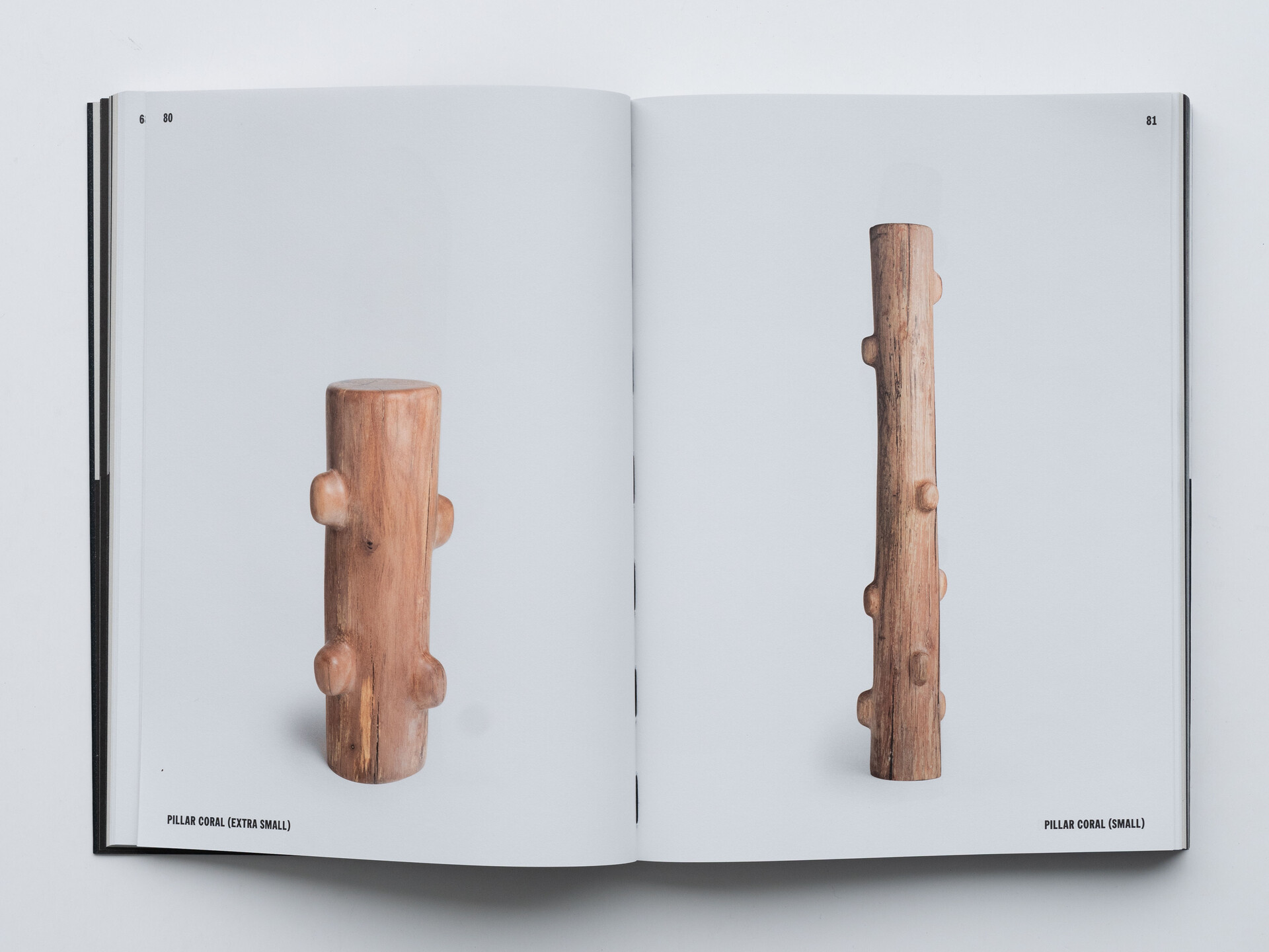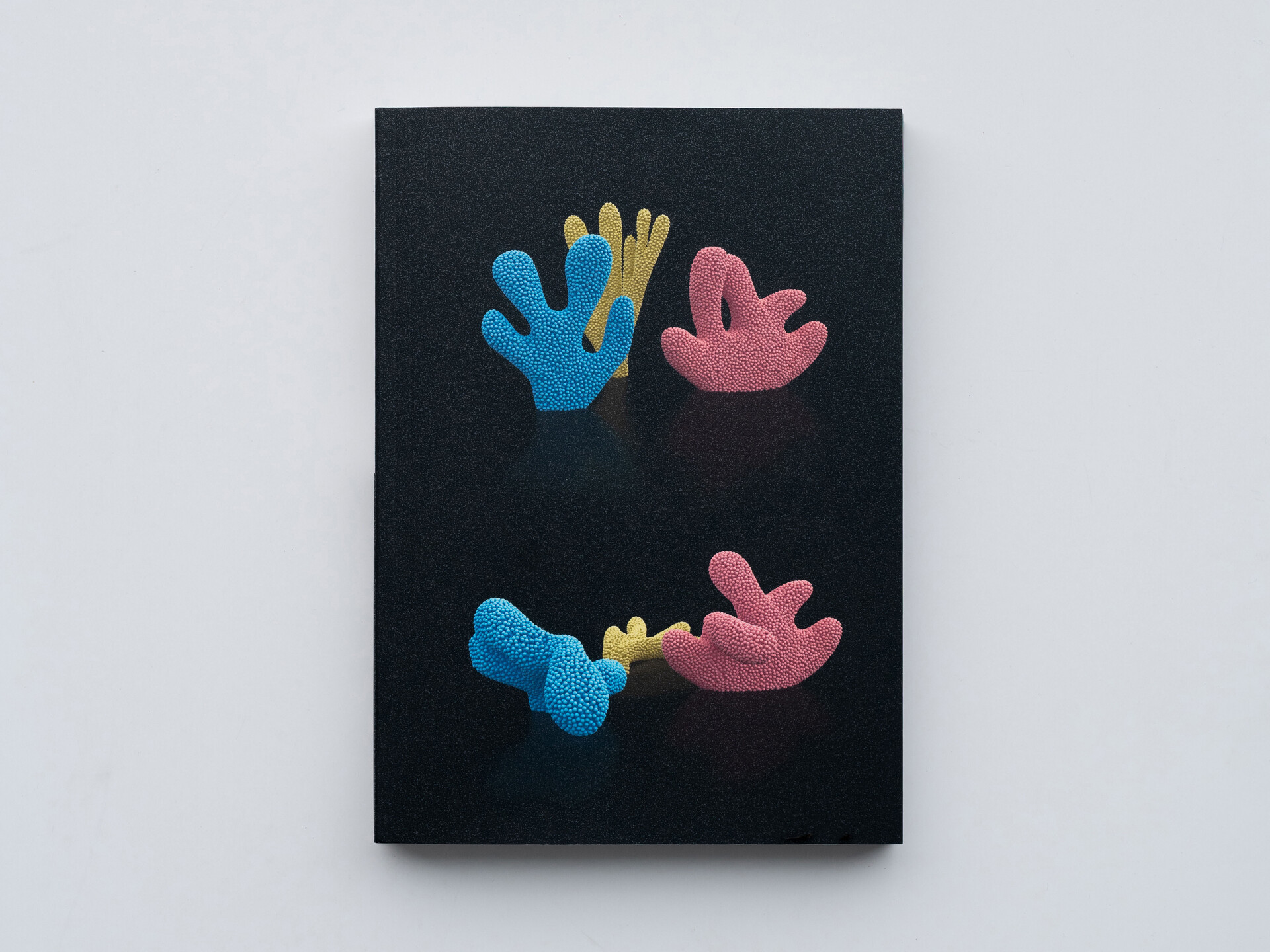 Snow-clad marble sculptures of cactuses, pencil sketches of corals and renderings of leaf shapes seemingly suspended in mid-air, interspersed with grids of neon-colored sculptures and alarming newspaper headlines warning of the “ghastly” climate apocalypse that lies in store for us: This artist's book explores the diverse reference system of forms and materials, plants, animals and other subjects out of which Claudia Comte develops her biomorphic sculptures. While cactuses are well adapted to arid conditions, coral reefs, which form bio-diverse ecosystems at the bottom of the marine food chain, are wasting away due to the warming and acidification of the ocean. Leaves, on the other hand, represent photosynthesis, the energy-converting process that gives off oxygen. Comte’s supernatural fusion of cactus, coral and leaf draws connections between aspects of the desert, ocean, and forest through various processes of material metamorphosis.