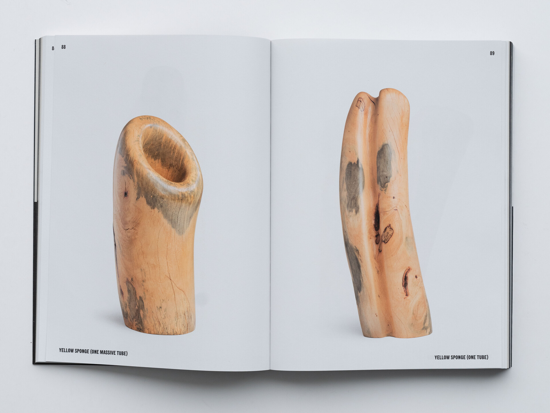 The book begins with an index of Comte’s wooden sculptures, on which she confers first-name monikers, as if they were her familiars. Based on sketches, they are carved in wood or executed in marble with the aid of digital media. So marble, a petrified representation of the sea, meets wood, a place of storage for natural terrestrial processes and a constant source of oxygen.