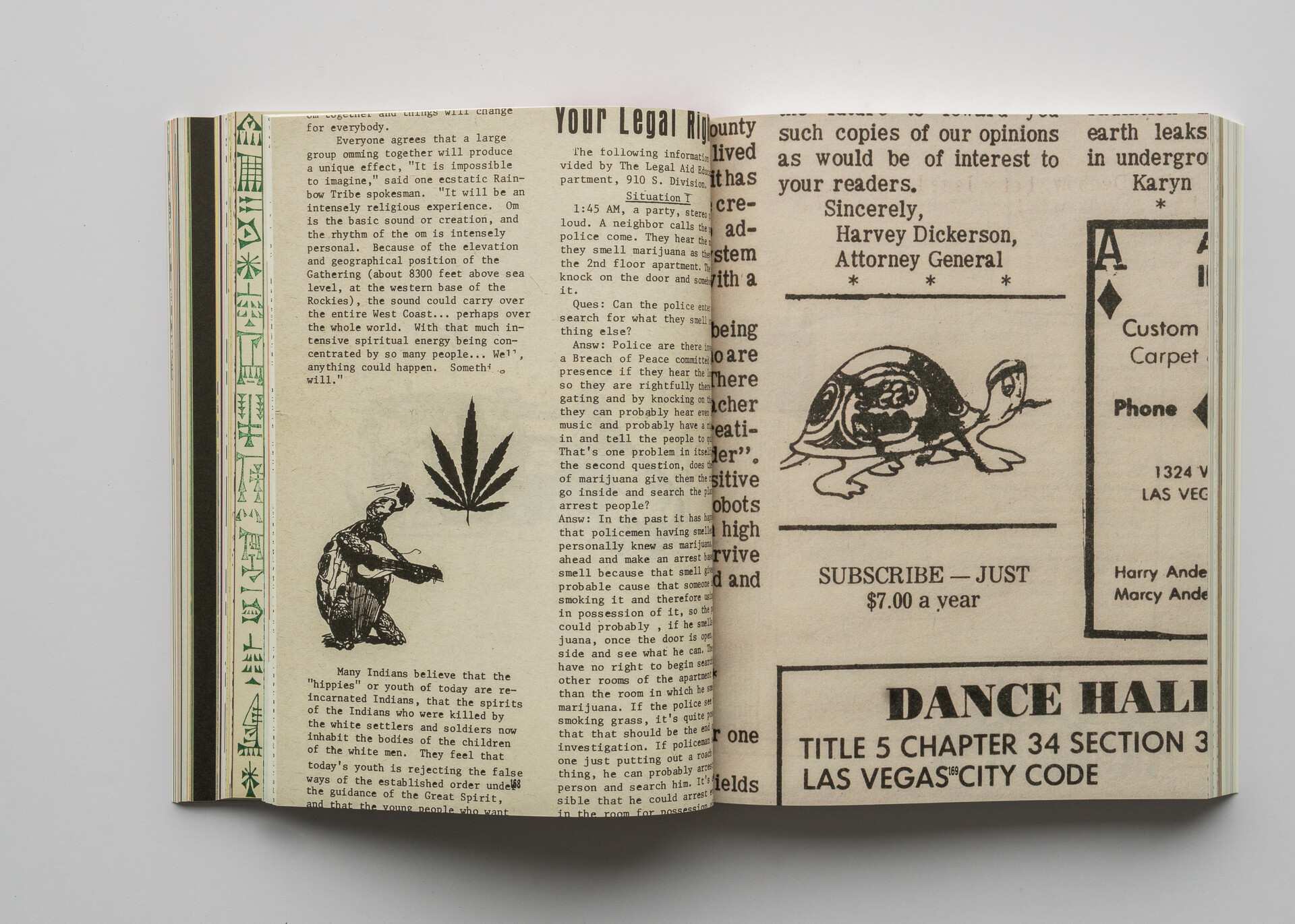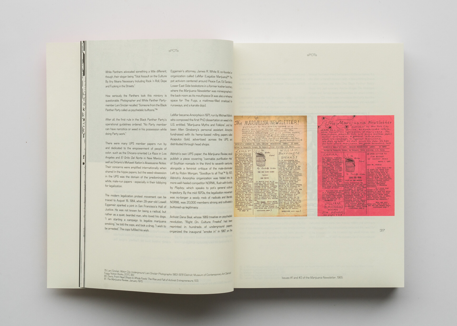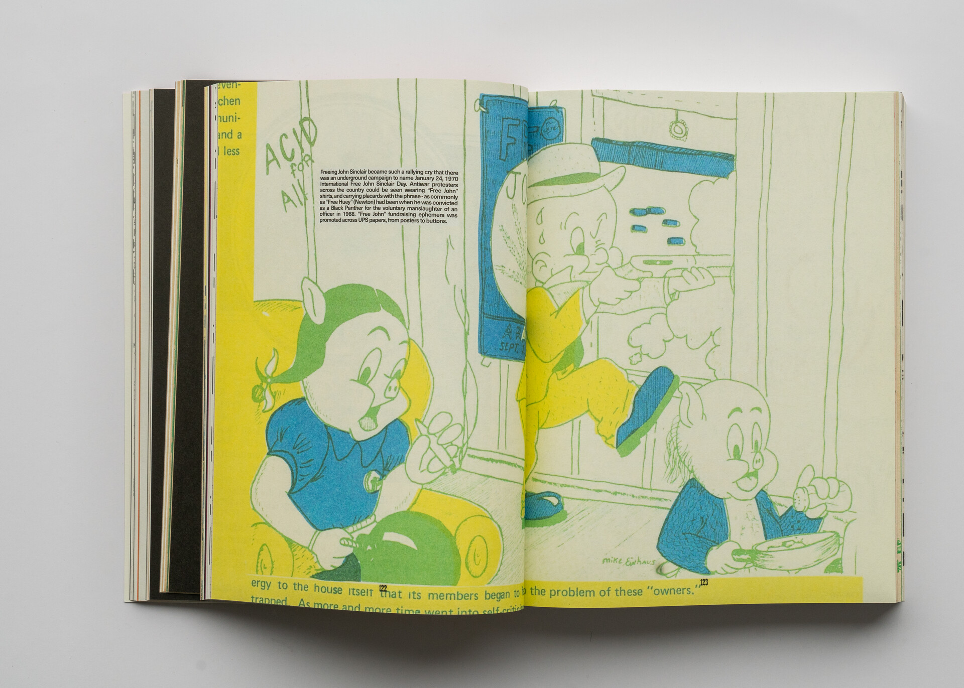 Weed was so pervasive it became a helpful means for government agencies to crack down on the UPS. Weed came to emblematize activist groups, and added a touch of flair to the mastheads of UPS titles. Weed permeated UPS pages, with gaps in text crammed with weed-inspired “spot illustratios”.