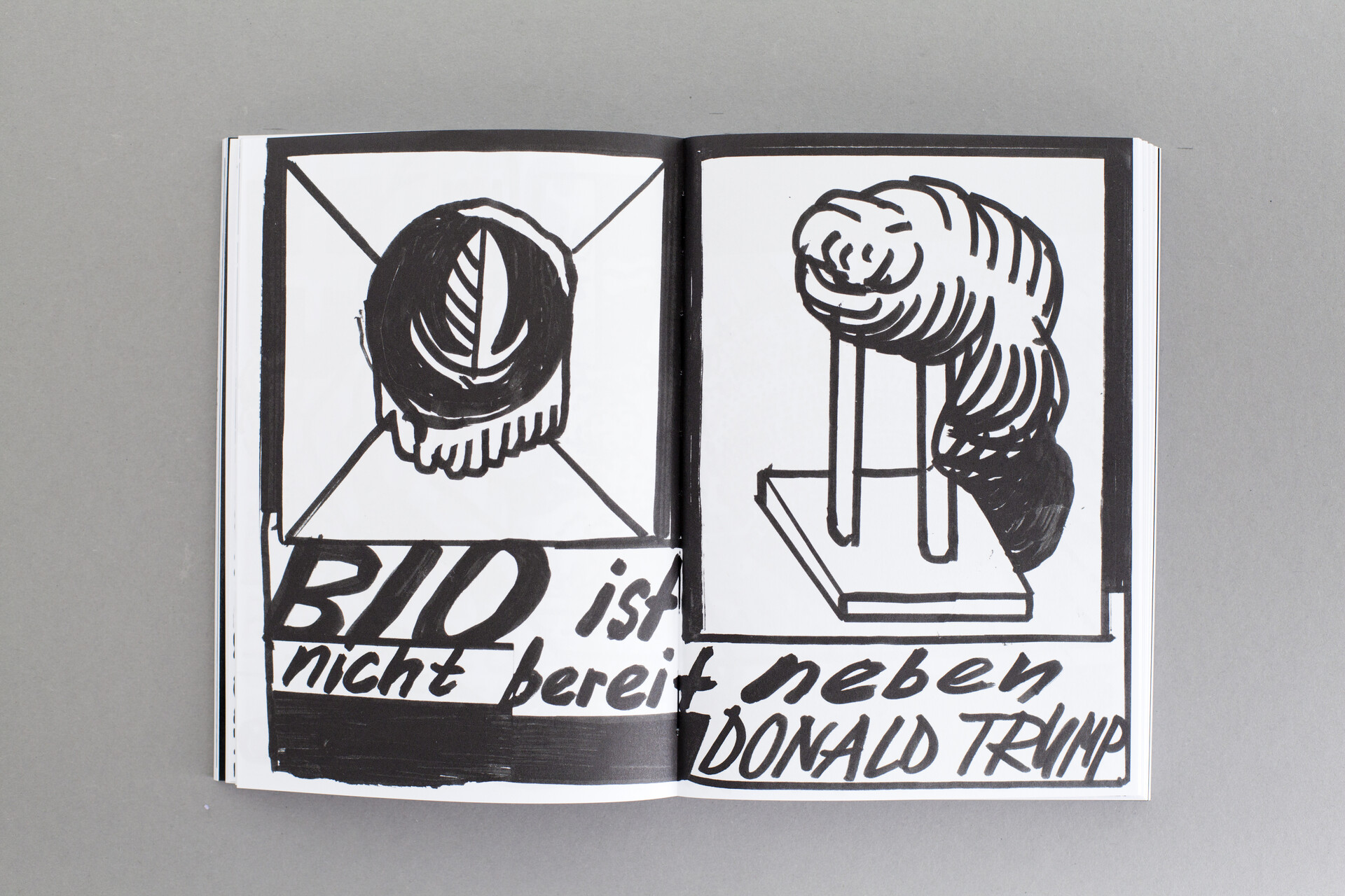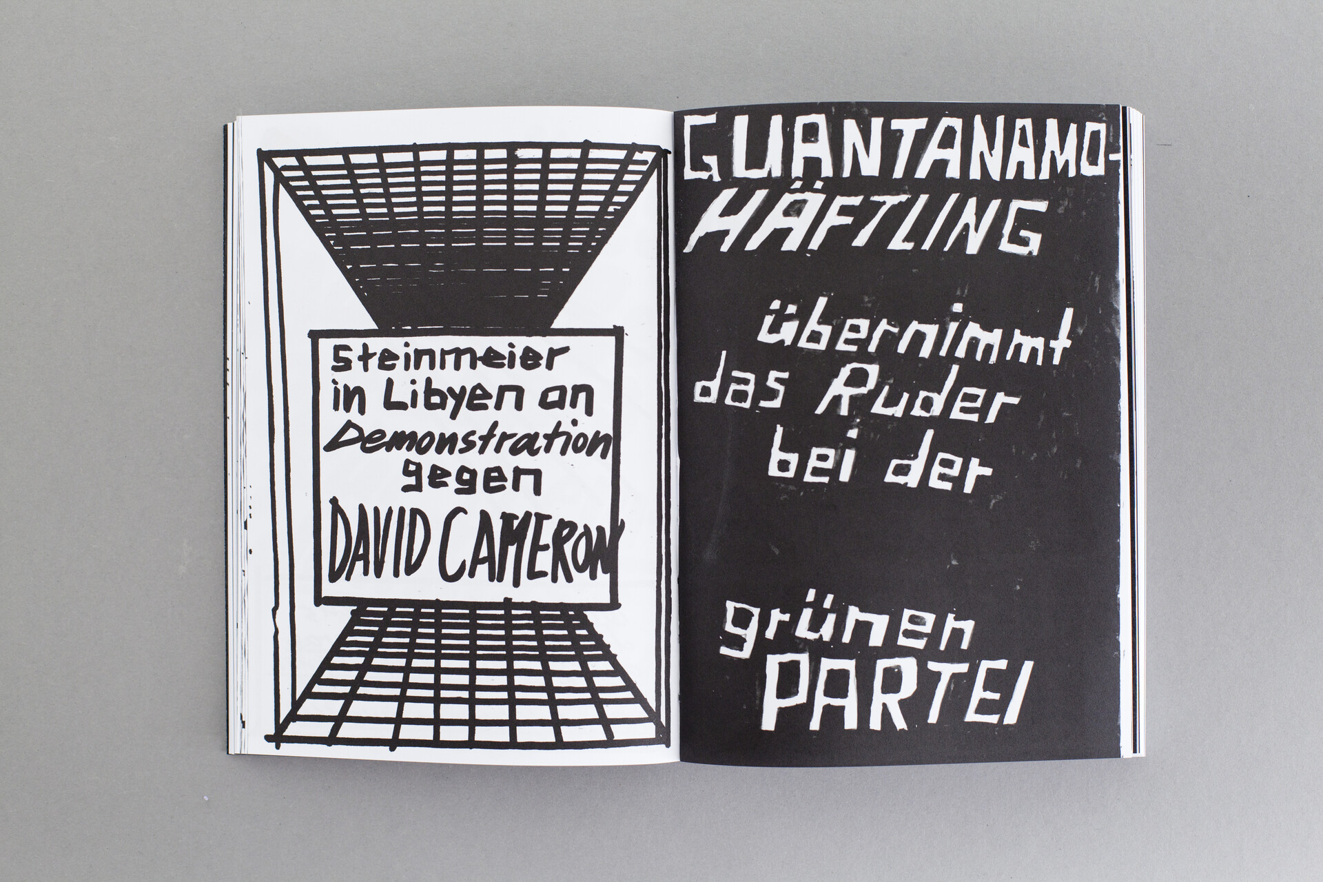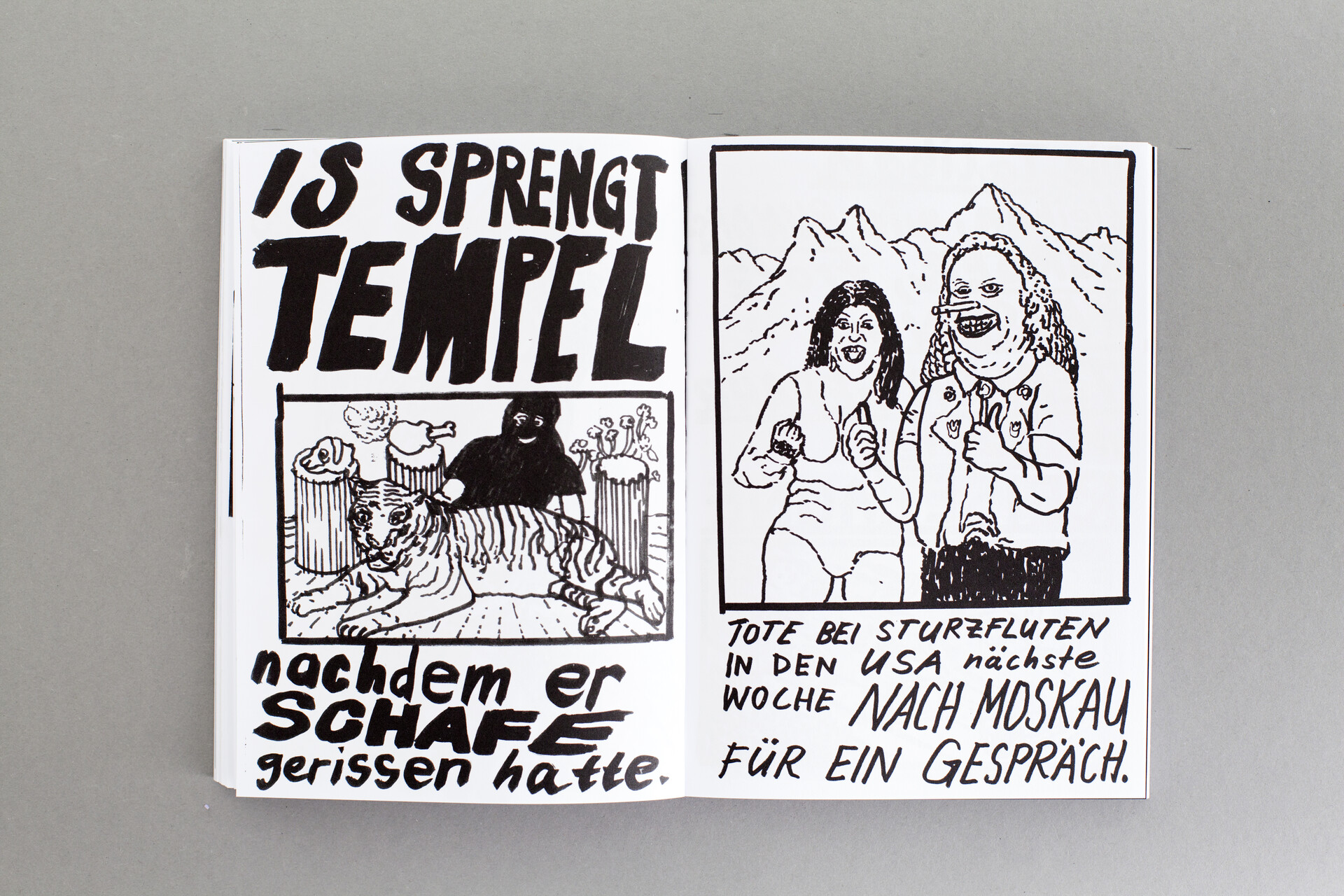 After the definitive switchover from analog to digital television about three years ago, Luca Schenardi noticed some puzzling non sequiturs one day while viewing teletext – one of his preferred media. In the wake of the digital TV revolution, teletext headlines on a number of channels were scrambled and apparently randomly recombined. In early 2015, for example, Schenardi happened upon the following item: “Pegida Alliance supporters held another rally in Dresden last night. According to the police, roughly 17,000 Pegida activists turned out at the Semperoper [Dresden opera house]. Meyer calls it free coffee.” This gem of a non sequitur was clearly worth saving, whereupon Schenardi began perusing and photographing teletexts on various channels every day. Seized with a mania for collecting suchlike glitches, he transcribed them in black marker and tusche into self-made A5-size notebooks and illustrated his finds with sketches. To date he has filled twenty such notebooks, roughly eight hundred pages, with this peculiar collection.