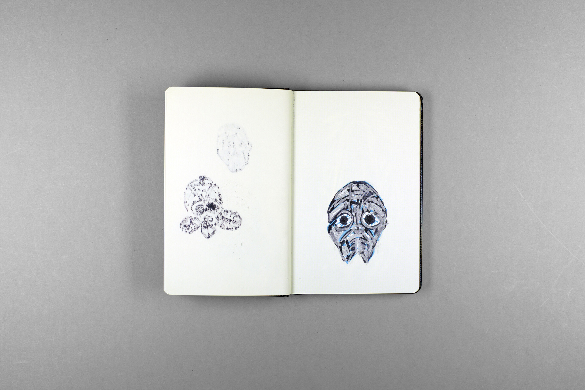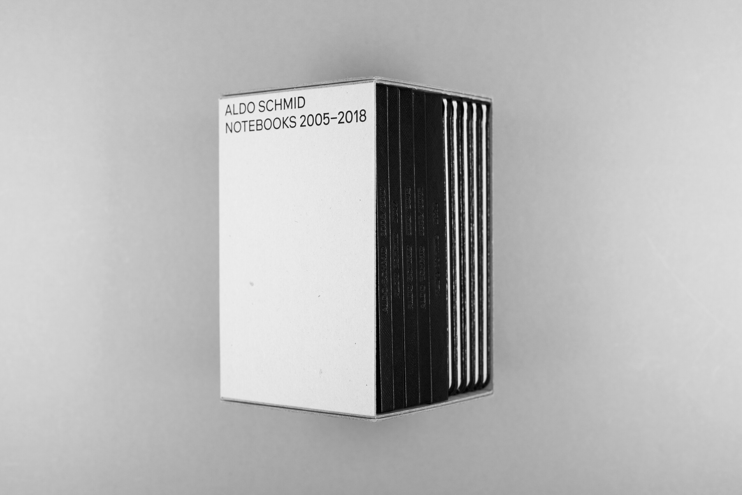 Notebooks 2005–2018 is a collection of ten facsimiled Moleskine notebooks filled with works by Swiss artist Aldo Schmid. Created from 2005 to 2018, these visual worlds take us through abandoned factories and obscure picture-postcard idylls to the hollowed-out codes of modernity and a space of memory evoked by press photos. En route we meet a bizarre cast of characters including grotesque officials, creatures wearing twisted grimaces and masks, and dopey robotic and cartoon-like characters.