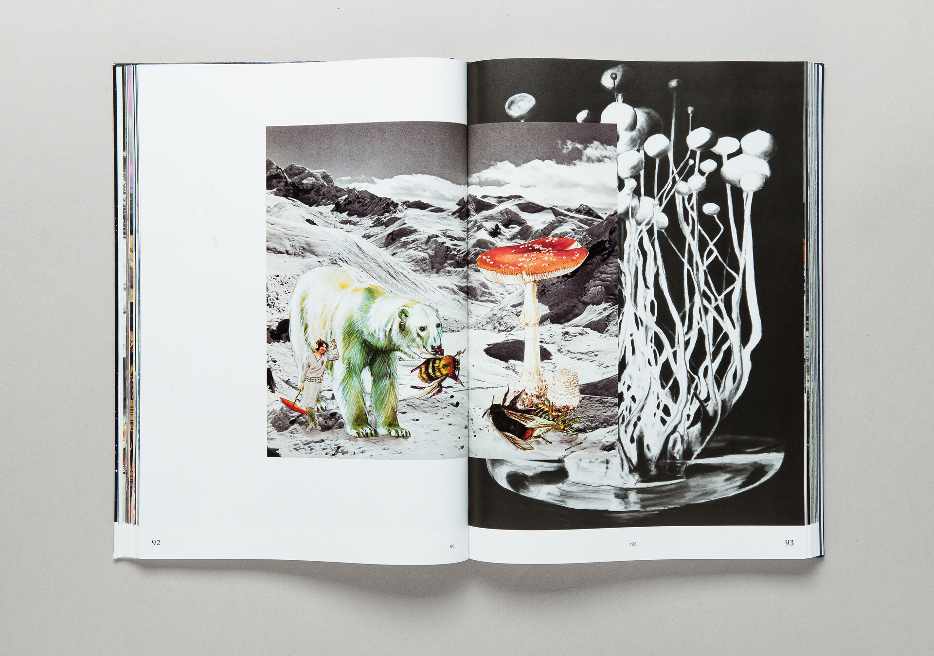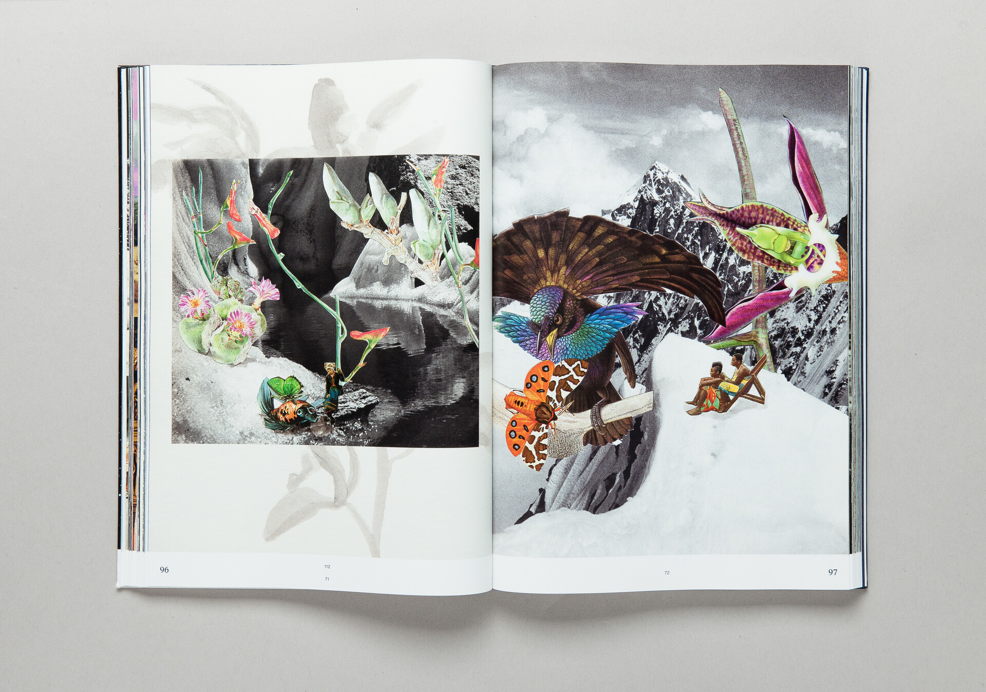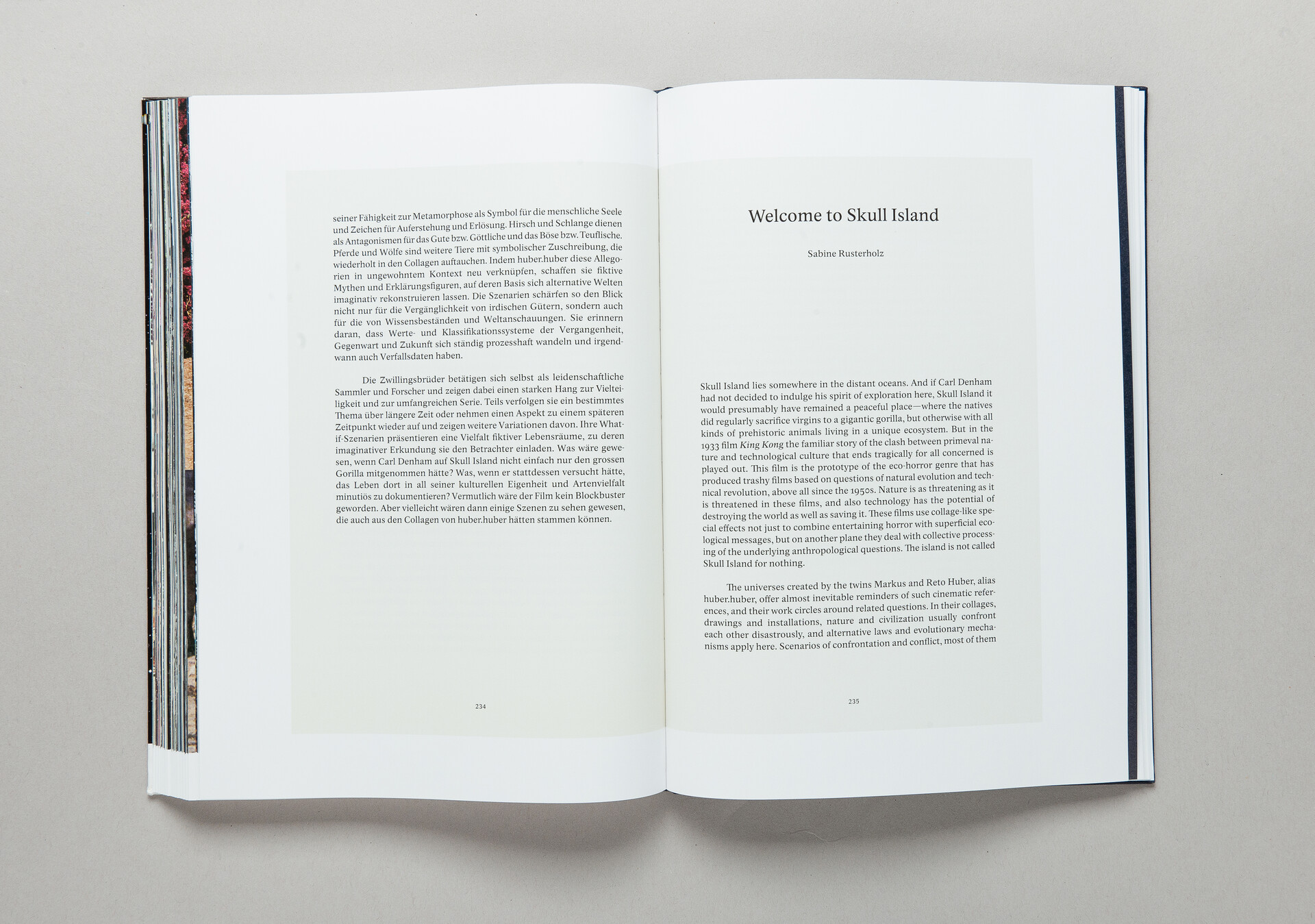 Universen, an unconventional mix between an art book and an oeuvre catalog with picture register, is huber.huber’s first major publication. The two artists (Markus and Reto Huber) from Zurich draw the observer into a wonderfully luxuriant realm of images that they created using their virtuosic — analog — collage technique. A selection of collages and ink drawings from the large group of works titled MIKROUNIVERSUM (2005-2011) is presented in a relatively chronological order as a “guiding series” through the collected works. Other pieces are interjected between them which adopt aspects of the “guiding series” and transform into increasingly complex collages. In this way, as many as four reproductions from various groups of works are interwoven into new picture compositions. Thus the book shows not only a representative view of what was created over the last four years, but also gives an illuminative impression of huber.huber’s artistic work methods. A picture register listing each individual work and presenting it again in miniature format adds clarity, helping to unscramble the original pieces and place huber.huber’s individual groups of works and periods of creativity into a clear order.